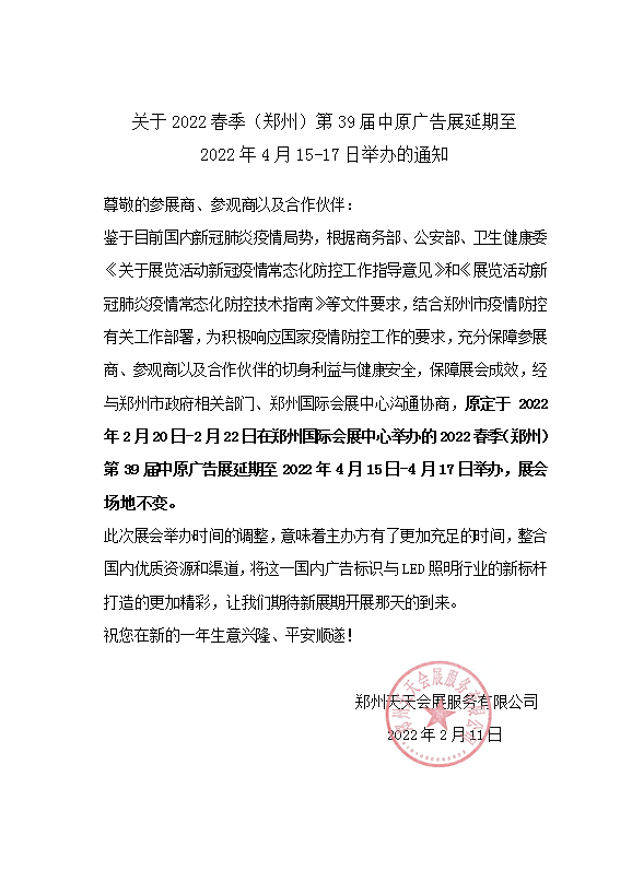 根據(jù)近期國內(nèi)新冠肺炎疫情形勢,為積極響應(yīng)國家疫情防控工作的要求,充分保障參展商、參觀商以及合作伙伴的切身利益與健康安全,鄭州天天會展服務(wù)有限公司將原定于今年2月20-22日舉辦的2022春季(鄭州)第39屆中原廣告展延期至4月15 -17日進(jìn)行,展會原定場地不變。